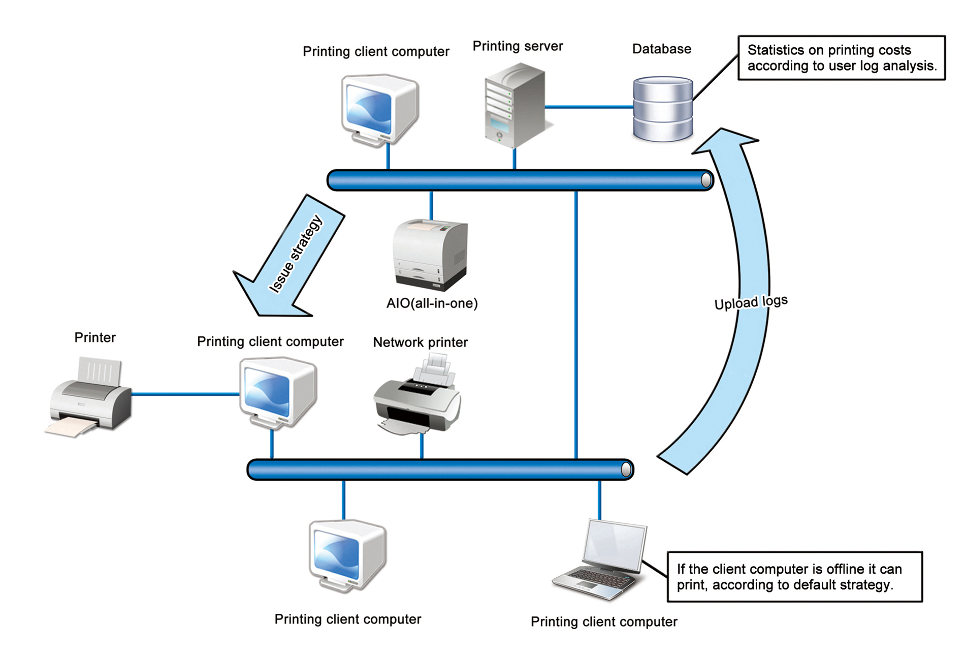 Statistical Reports: The server integrates log information about user print behavior considering paper type cost, which printer, which user, which department, which time period and provides feedback forms to responsible business people for examination and validation.