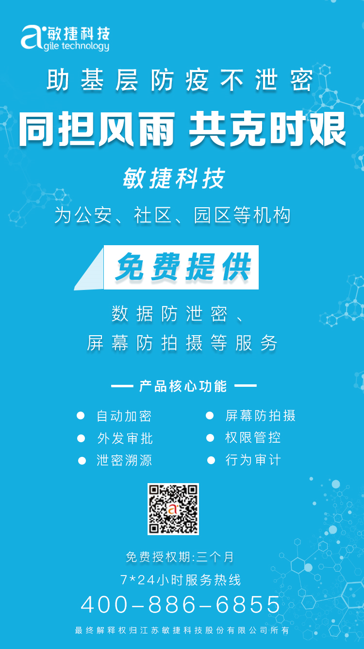 敏捷科技為防疫一線的社區、公安、醫院、園區等提供基層社區疫情管理數據防泄密方案,助力奮斗在防疫攻堅一線的基層工作人員打好疫情防控“攻堅戰”。